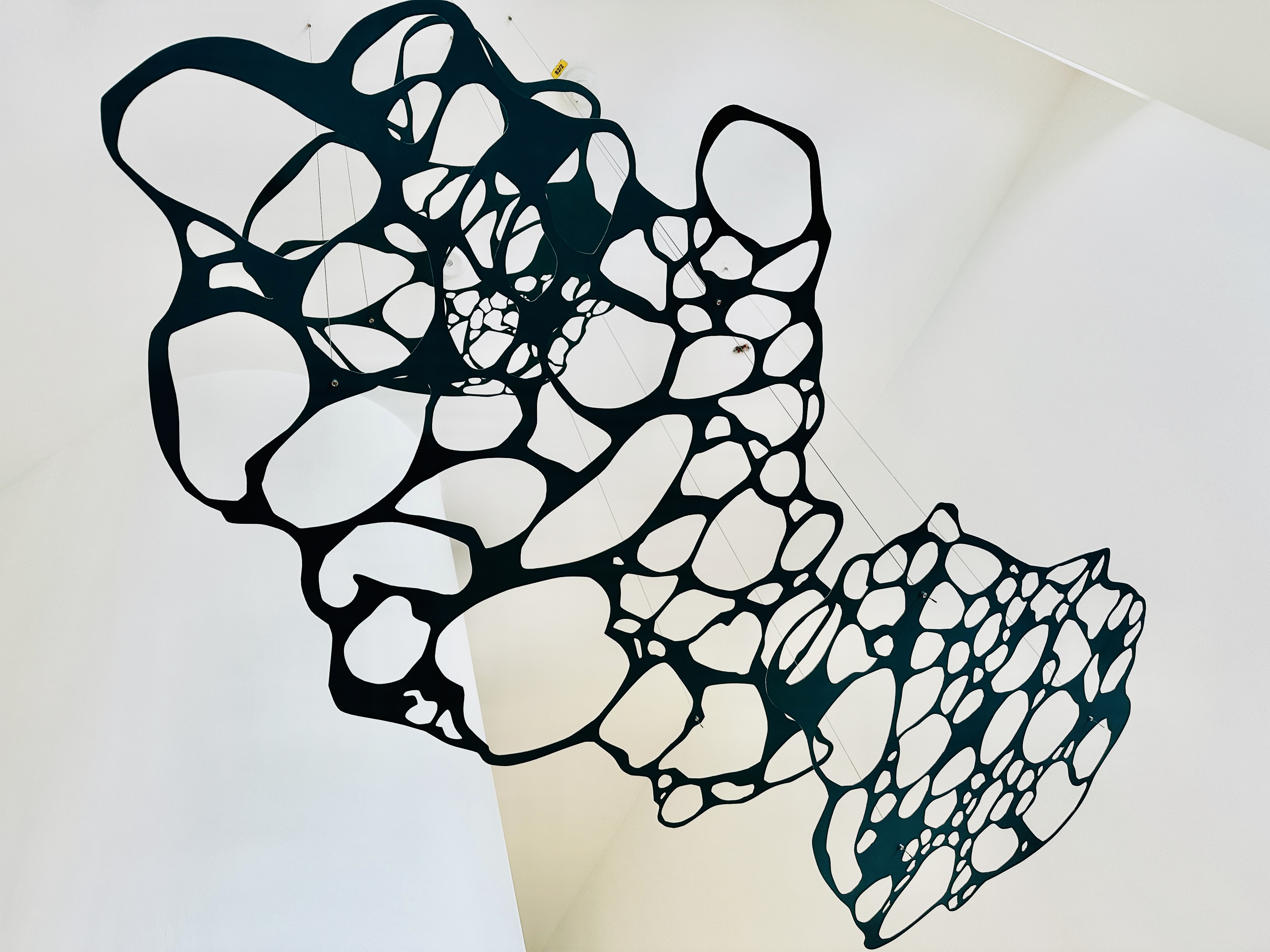 Auch abstrakte Werke zieren unser Rathaus: An der Decke des Treppenhauses hängt eine filigrane Skulptur von Cornelia Hesse, die allerdings nicht wirklich abstrakt ist: Sie bezieht sich in ihrer chromglänzenden Decken-Skulptur, die die Jury auf Anhieb überzeugt hat, auf die Kieselsteine, wie sie am Ufer des Starnberger Sees im Wasser zu sehen sind, und den Schatten dazwischen. Cornelia bringt sie buchstäblich zum Schweben. Aus mehreren Fotos der Kiesel entwickelte sie eine blubbernd luftige Skulptur.