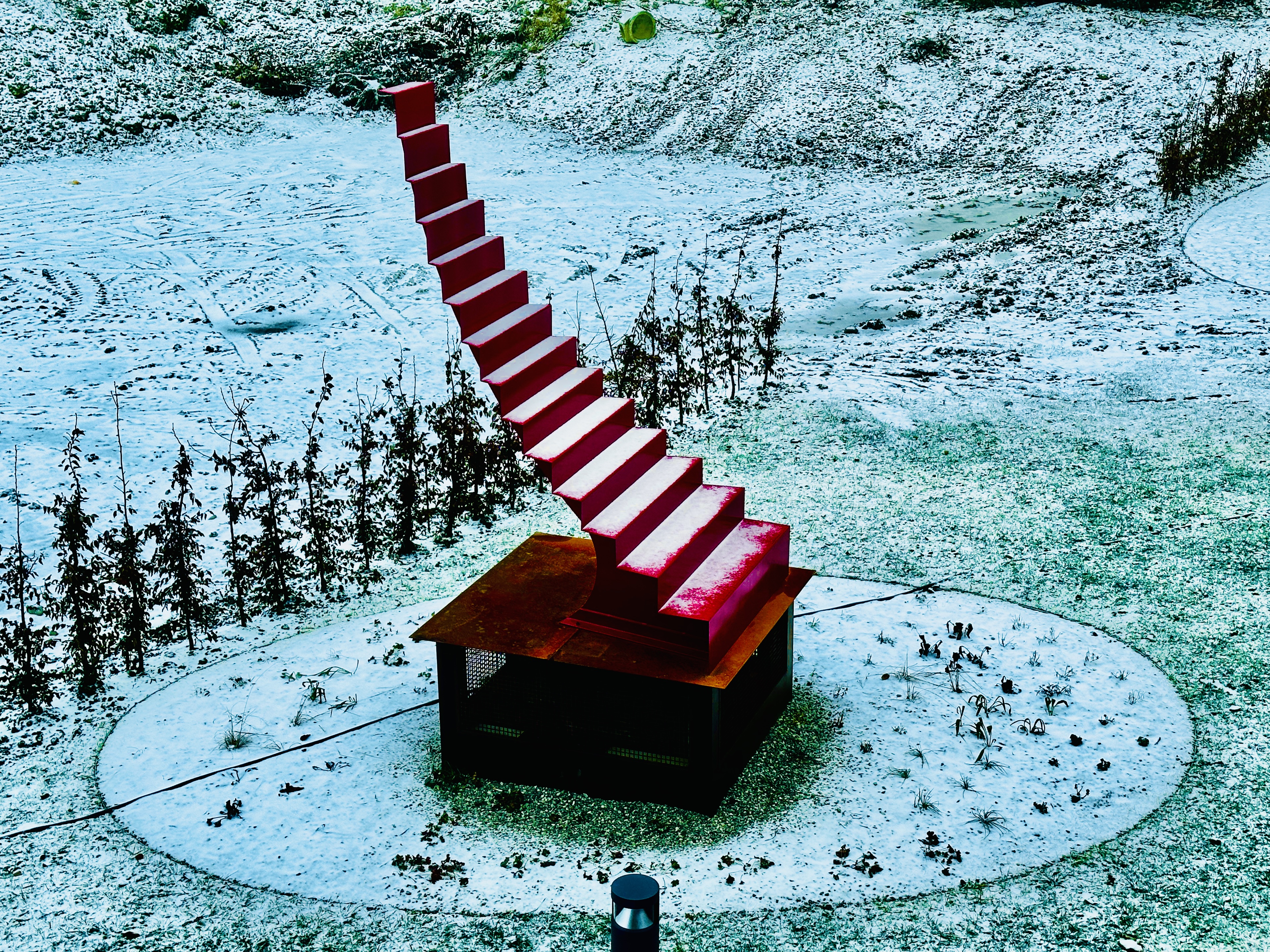 Und im Außenbereich dann Roman Wöhrl, der dem von ihm verfertigten König-Ludwig-Spruch auf dem Kreisel im hinteren Bereich des Rathauses einen knallroten “Stairway to Heaven” entgegengesetzt hat, dem er – nach Martin Buber – den Titel “Vom Ich zum Du” gegeben hat. Kein leichter Weg.