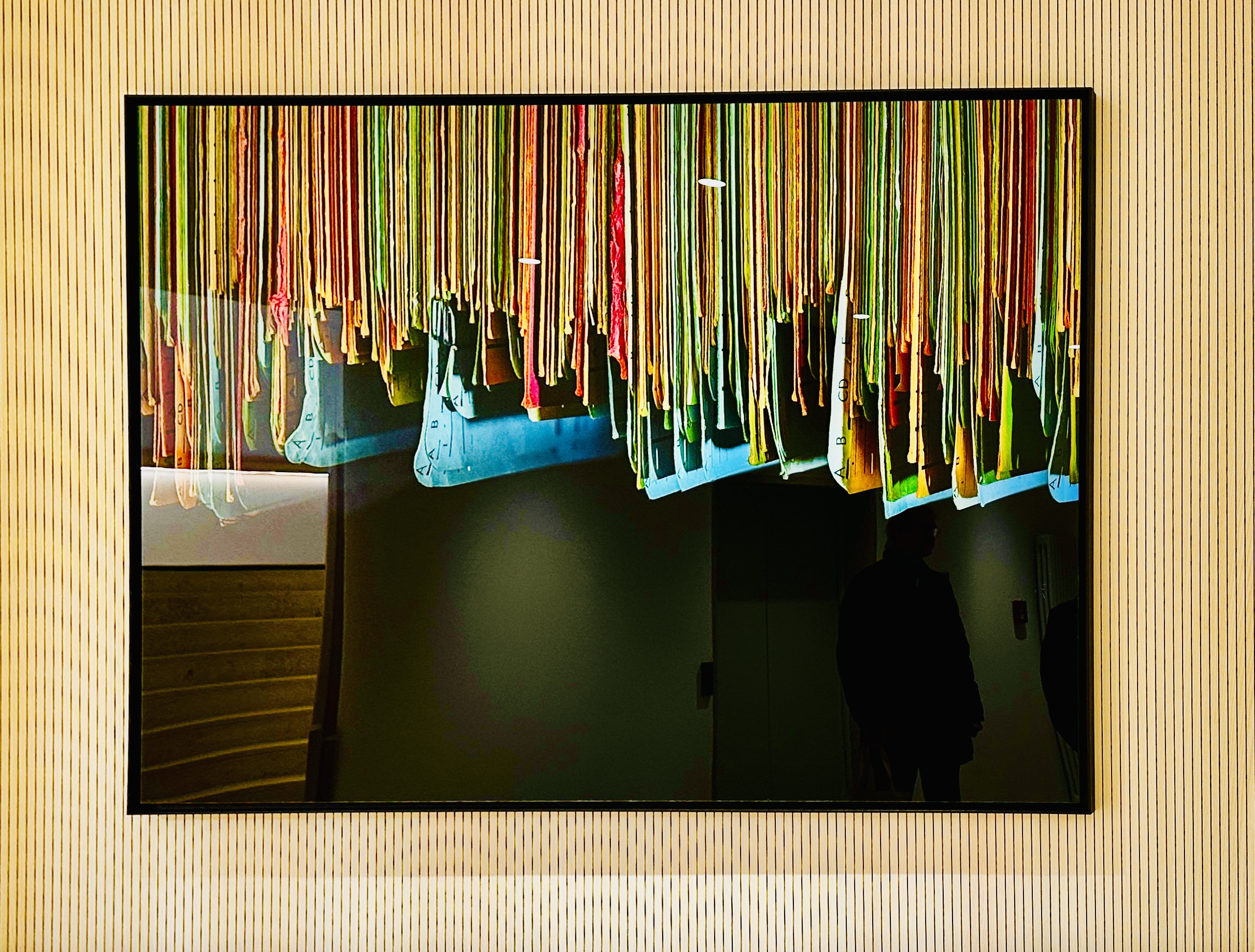 Der Fotograph Andreas Huber, eigentlich für eine Installation im Fahrstuhl vorgesehen, wählte lieber den Keller als Ort für seinen Diptychon. Dort trumpft er umso größer auf: Am Eingang des Archivs plazierte er zwei großformatige Aufnahmen einer Hängeregistratur, die allerdings wie ein furioses abstraktes Werk wirken.