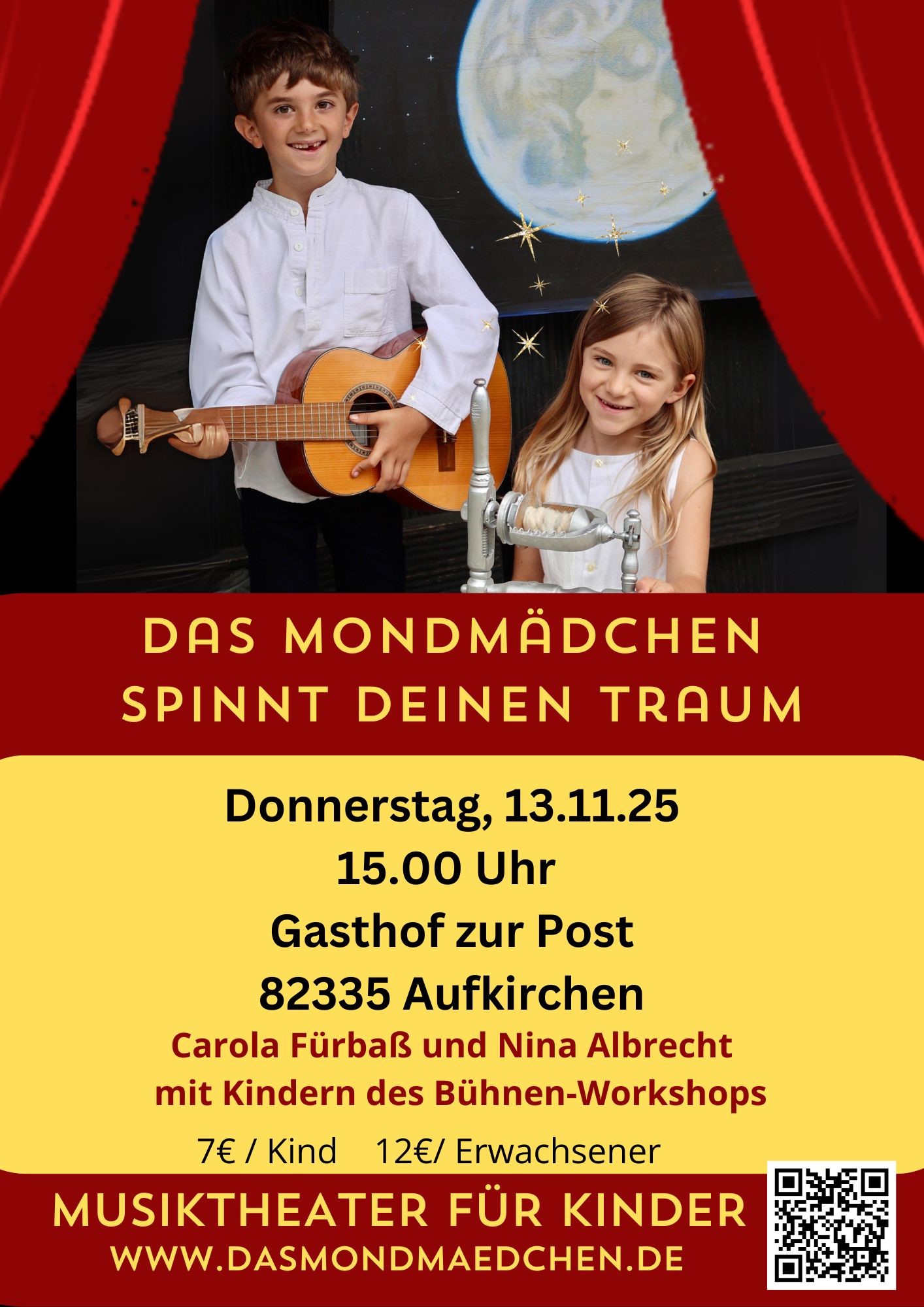 „Das Mondmädchen spinnt Deinen Traum“ entführt Jung und Alt in die Welt der Träume – mit Musik, Tanz und Spaß! In diesem interaktiven Theaterstück darf das Publikum aktiv mitwirken, während es das Mondmädchen begleitet, das die Träume der Menschen webt.