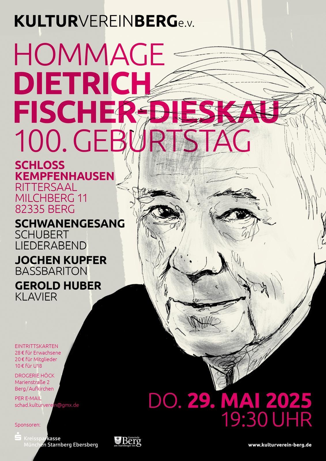 Aus Anlass des 100. Geburtstages des Jahrhundertsängers und Berger „Ehrenbürgers“ Dietrich Fischer-Dieskau veranstaltet der Kulturverein Berg auf Schloss Kempfenhausen mit hochkarätigen Solisten eine Hommage auf ihn.