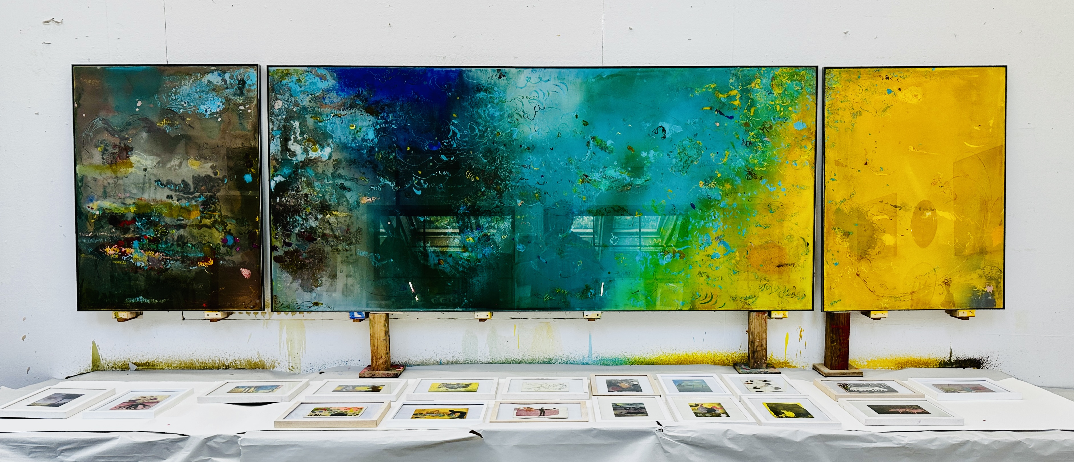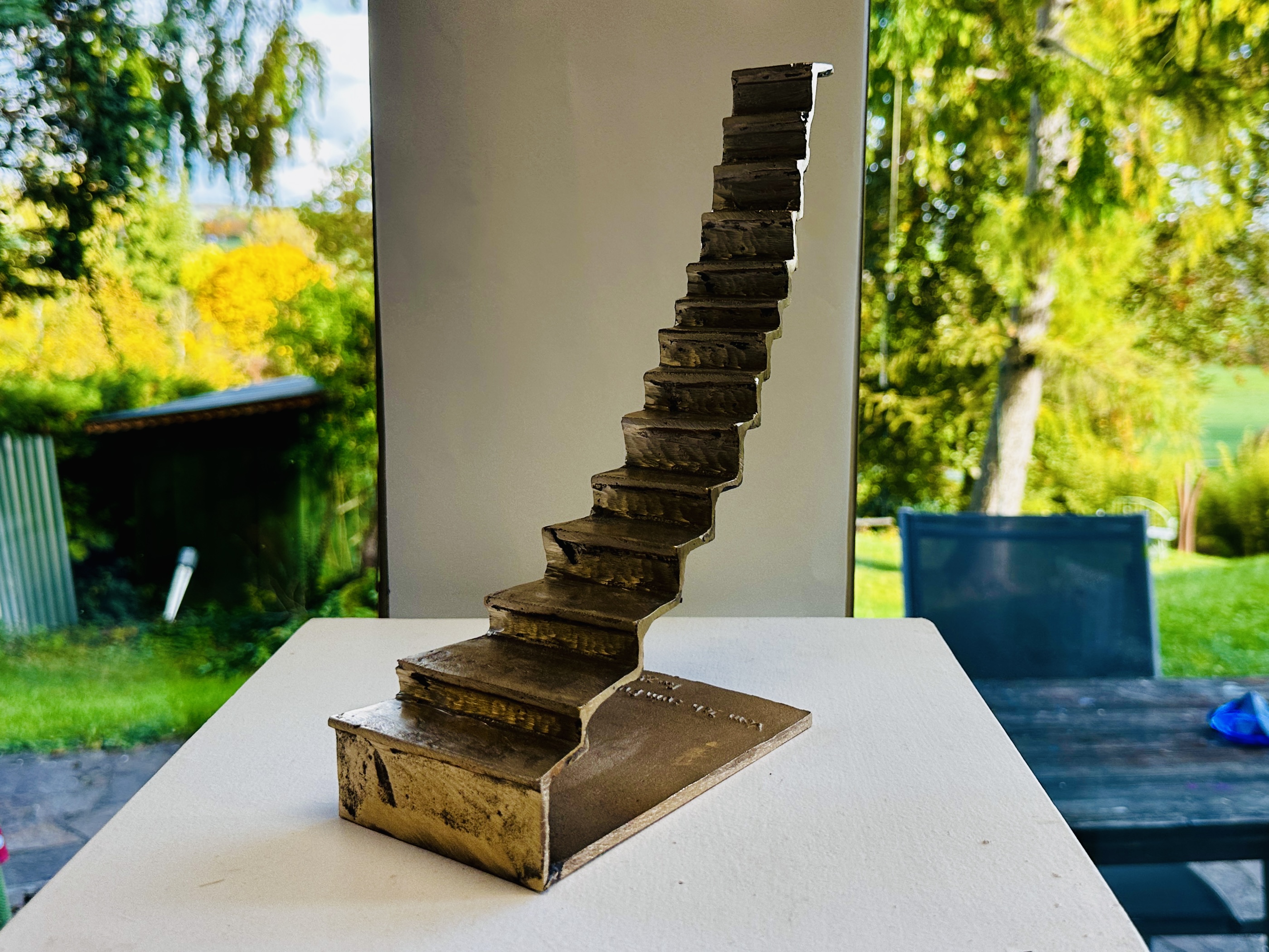 Juschi Bannaski präsentierte schon einmal ihr wirklich tolles Hinterglastripychon, das sie für den Eingangsbereich des neuen Rathauses geschaffen hat. Stolz erzählt sie, dass es sich bei dem Mittelteil womöglich um eines der größten jemals geschaffenen Hinterglasbilder handeln könnte. Bei ihr im Atelier waren gleich noch zwei andere der für das Rathaus geschaffenen Werke zu bewundern. Zum einen ein kleiner Bronzeguss von Roman Wörndls großer Himmelsleiter “Vom Ich zum Du”, die im Außenbereich des Rathauses stehen wird …