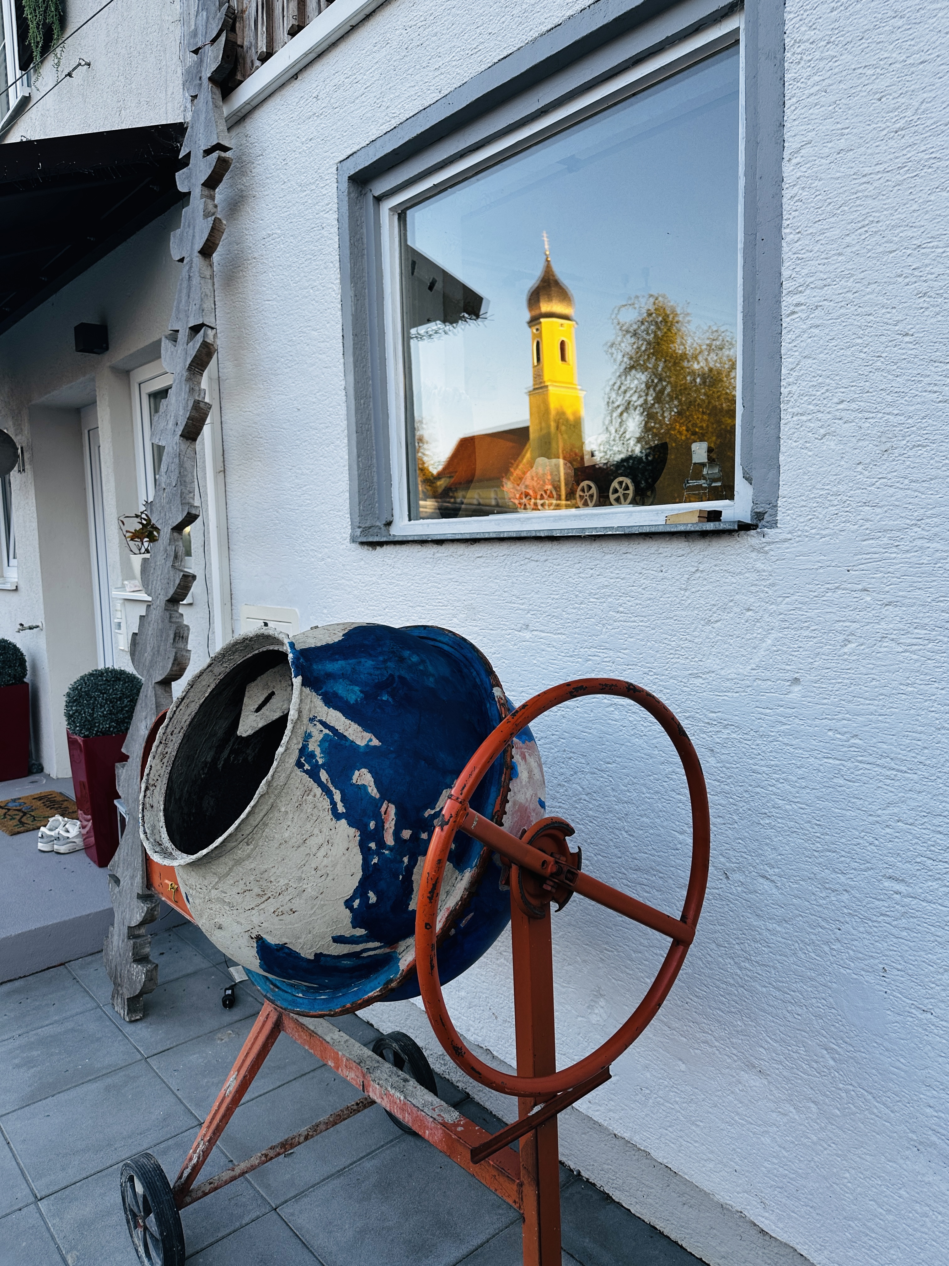 Und über den hier vielbesungenen Hans Panschar, der sein “Gemeinderad”, das vor dem neuen Ratssaal hängen wird, ebenfalls vornehm versteckkte, heute nur soviel: Seine Skulptur “Gehrt’s noch Lescha”, die aus einem mit Freiheitsstatuen, Handgranaten, Putinportraits und ähnlichem zeitgenössischen Unrat gefüllten Lescha-Betonmixer bestand, war mit Sicherheit das lauteste und originellste Werk der diesmaligen Ateliertage.