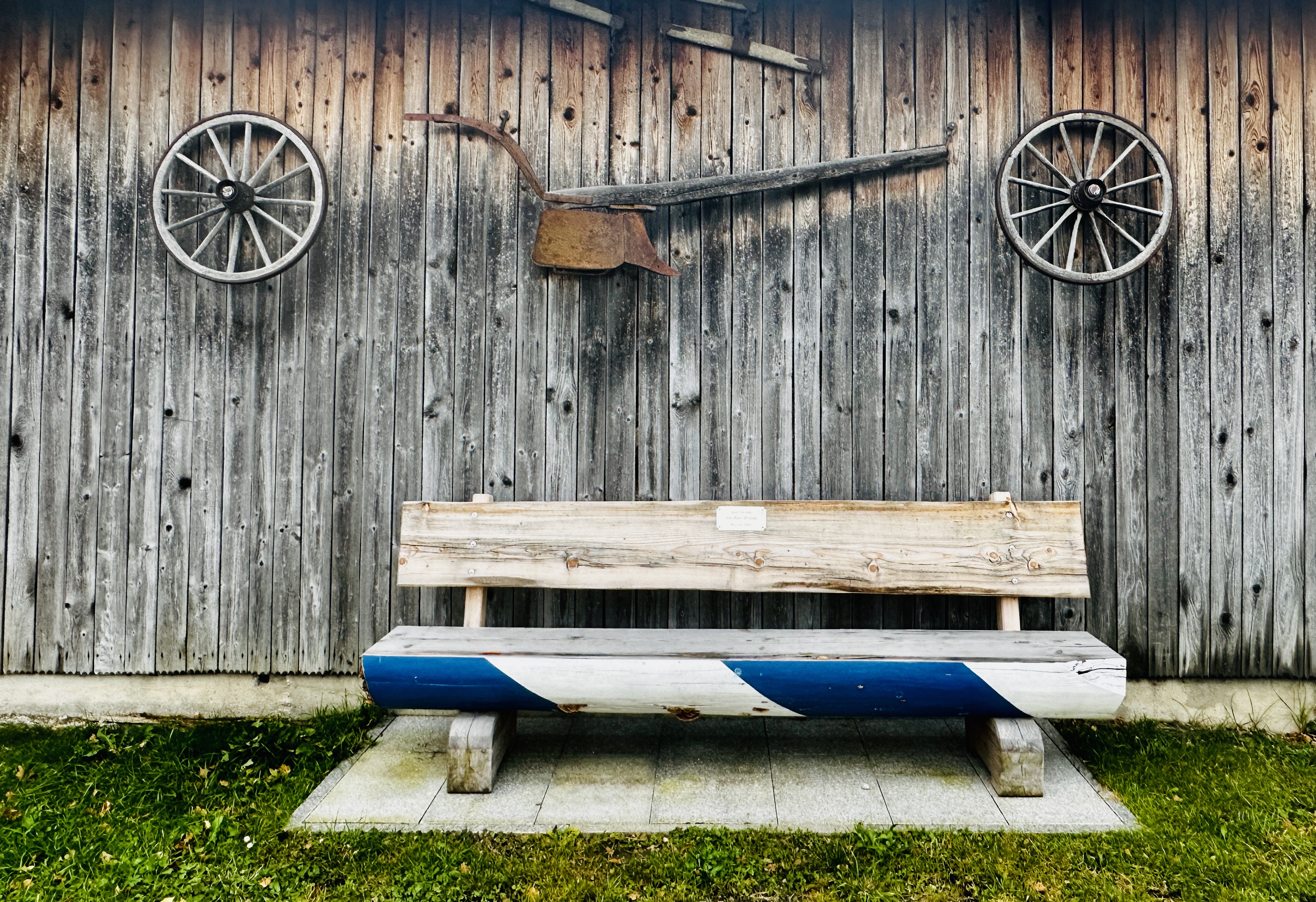 Wir sind wieder in Höhenrain, einem Ort, in dem wir überaus fündig geworden sind, was denkwürdige Orte betrifft. Am Stall des ehemaligen Gemeinderats Martin Klostermeier, der sich vorbildlich um das Dorfbild und die Erhaltung des Andenkens früherer Zeiten bemüht, befindet sich diese wunderbare Installation, die wie ein “Denkmal für den fleißigen Landwirt” wirkt: Über einer Bank aus Teilen eines Maibaums hängt ein dekonstruierter Pflug, bestehend aus der Pflugschar mit Grindel und zwei Rädern.