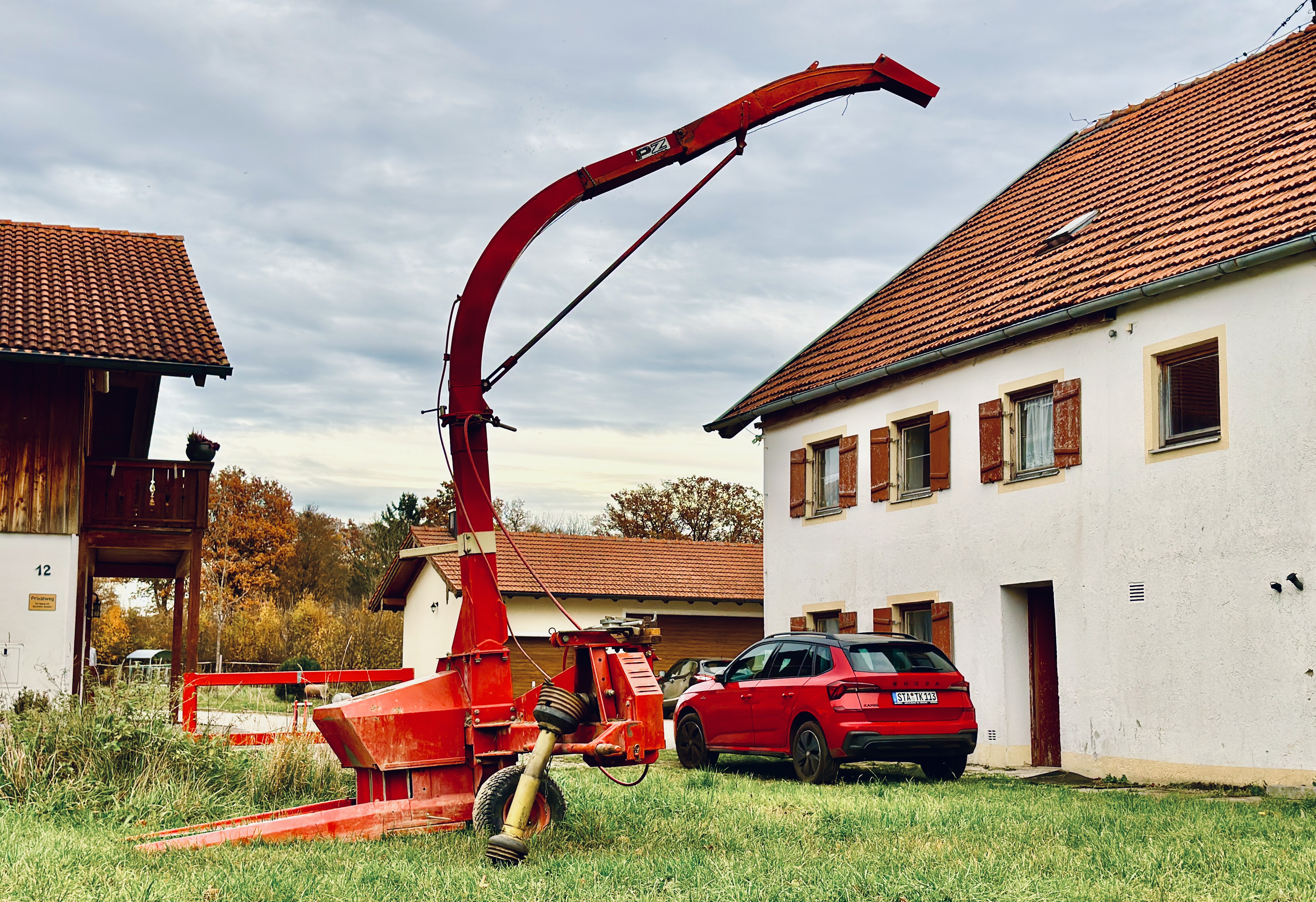Der rote Farchner Maishäcksler: einst Arbeitsgerät, jetzt eher monumentale Skulptur?