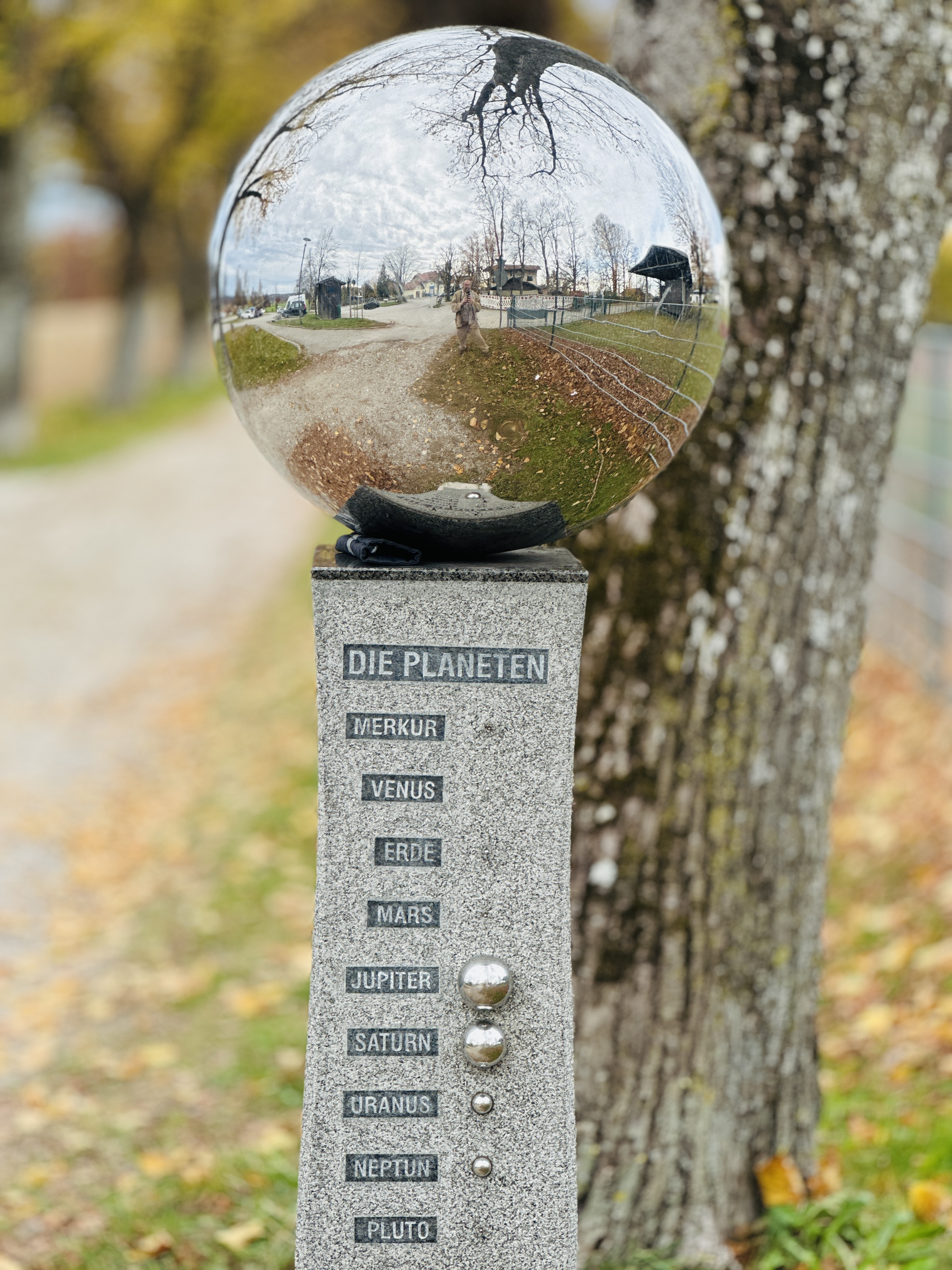 Leider ist der Planetenweg – wie viele große Werke – ein Fragment. So finden sich weder Merkur noch Venus zwischen Erde und Sonne, und auch wenn wir spazierend weiter in das Weltall hinaus streifen, finden wir nicht mehr viel vor. An der Lindenallee (und dem Planetenweg) befindet sich passenderweise auch die Christian-Jutz-Volkssternwarte, von wo man die Sonne in echt beobachten kann. Zum Beispiel bei der Sonnenfinsternis 2022, als dort sensationelle Photos unseres Zentralgestirnes gemacht werden konnten.
