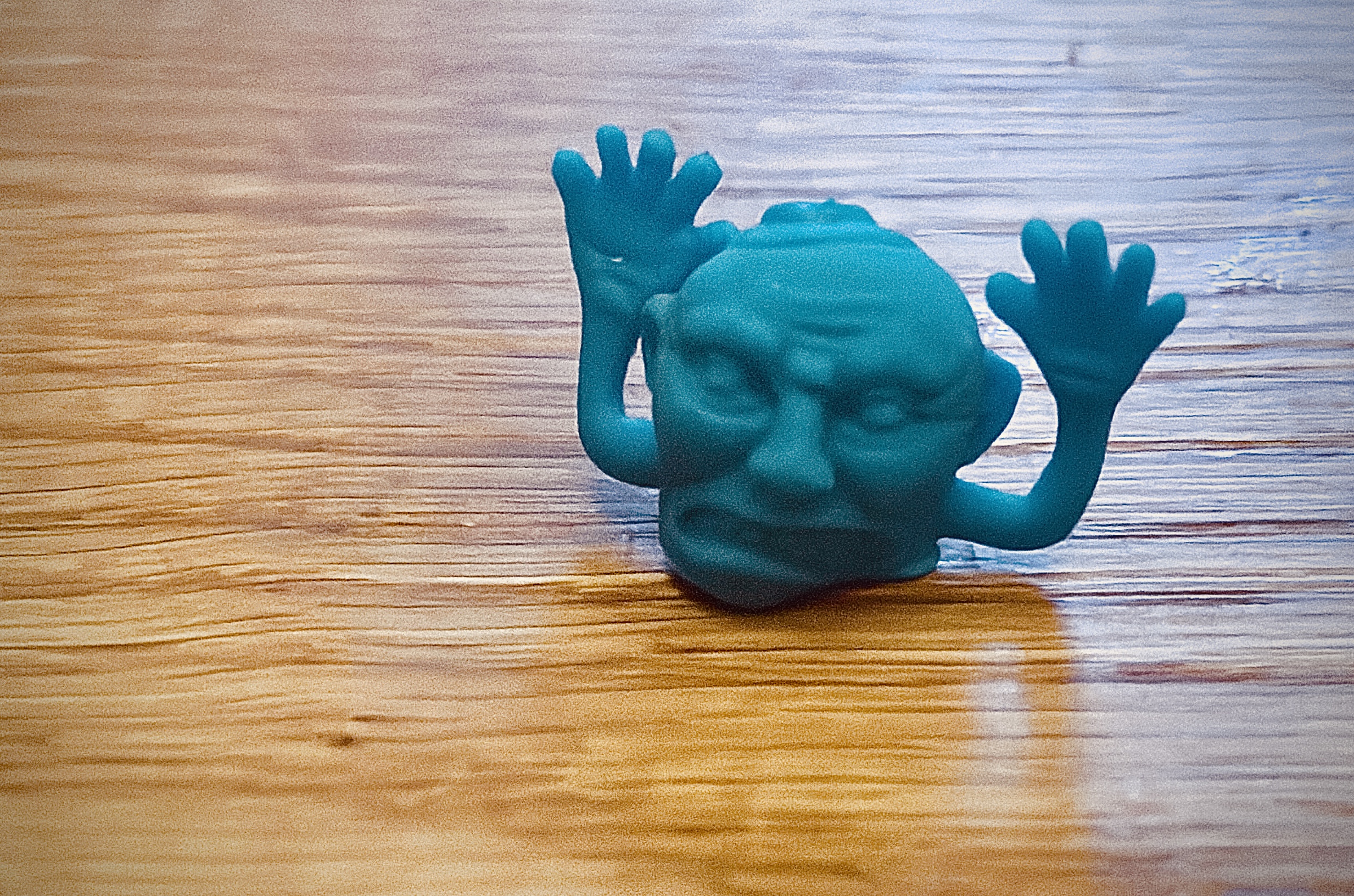 Wir haben den Automaten natürlich getestet und entschieden uns für die 20 Cent-Discount-Variante. Nach Einwurf eines entsprechenden Geldstückes ließ sich der Drehschalter leichter um 360 Grad drehen, als wir dies aus unserer Kindheit in Erinnerung hatten. Das Ergebnis (“Nicht zum Verzehr geeignet”) war ein herzallerliebst schreckliches Gummimonster als Bleistiftaufsatz. Testergebnis: jeden einzelnen Cent wert!