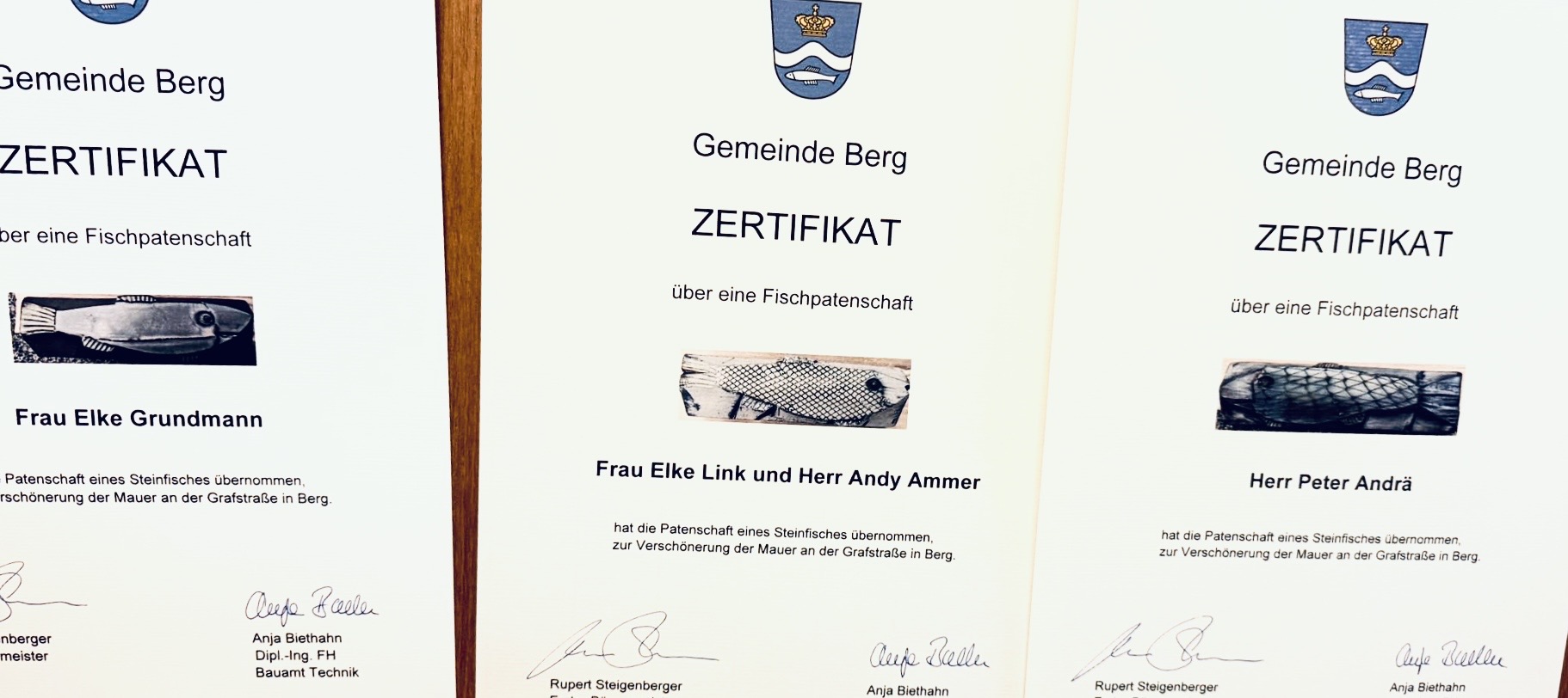 Alle Patinnen und Paten bekamen am vergangenen Freitag ein Zertifikat mit dem Bild des von ihm gespendeten “Steinfisches”, mit dem aus einem potentiellen Schandfleck der Gemeinde eines fröhliches Mahnmal für die Kraft der Kunst geworden ist, die mit einer netten Idee und geringsten Mitteln die Welt ein wenig schöner machen kann:
