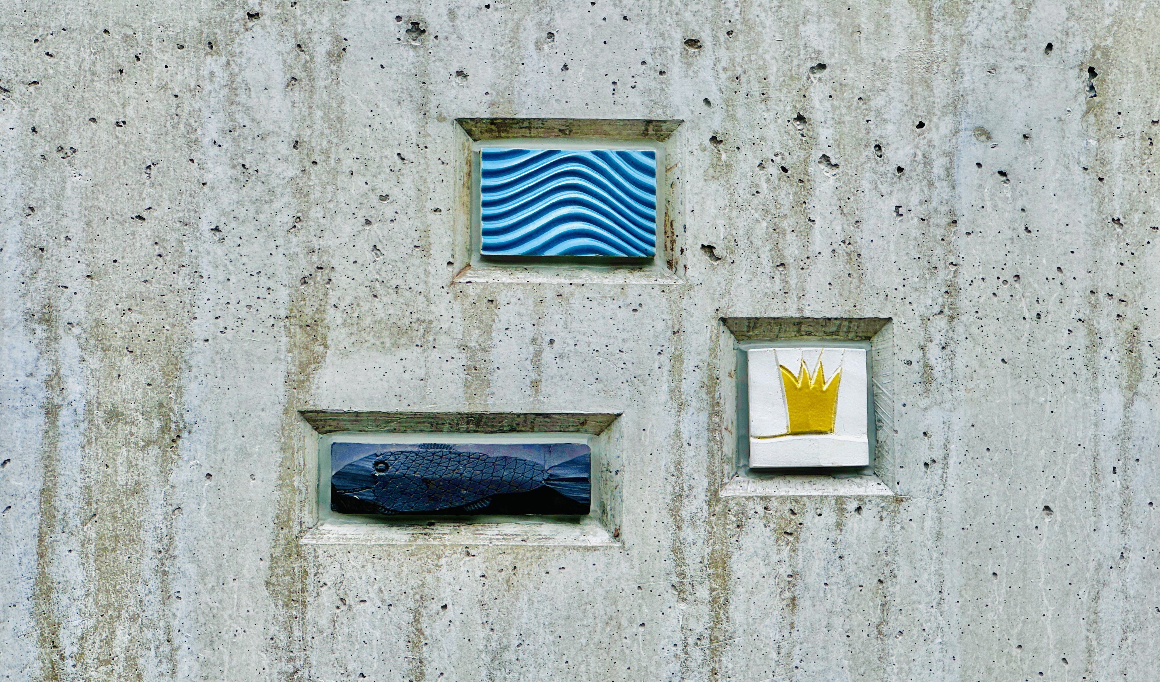 Es wurden Berger Bürger gesucht, die sich als “Paten” dieser Fische betätigen und mit einem zweistelligen Betrag deren Anschaffung finanzierten. Der Bürgermeister selbst sponsorte das zentrale Werk: eine dekonstruierte Version des Berger Dorfwappens, das aus Krone, Welle und einem Fisch besteht.