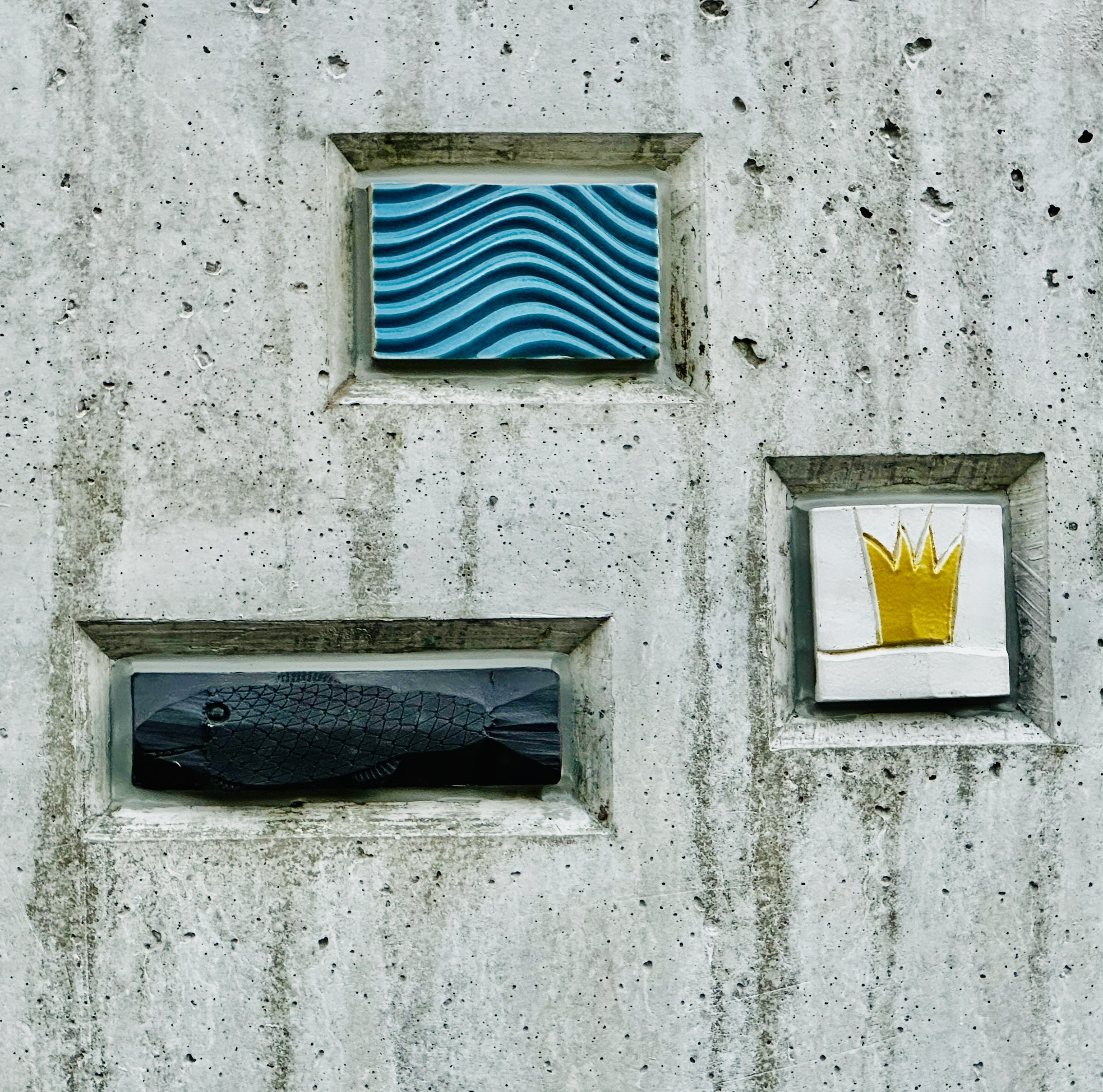 Besonders schön ist in der Mitte der Wand die Dekonstruktion des Berger Wappens aus Welle, Fisch und Krone: