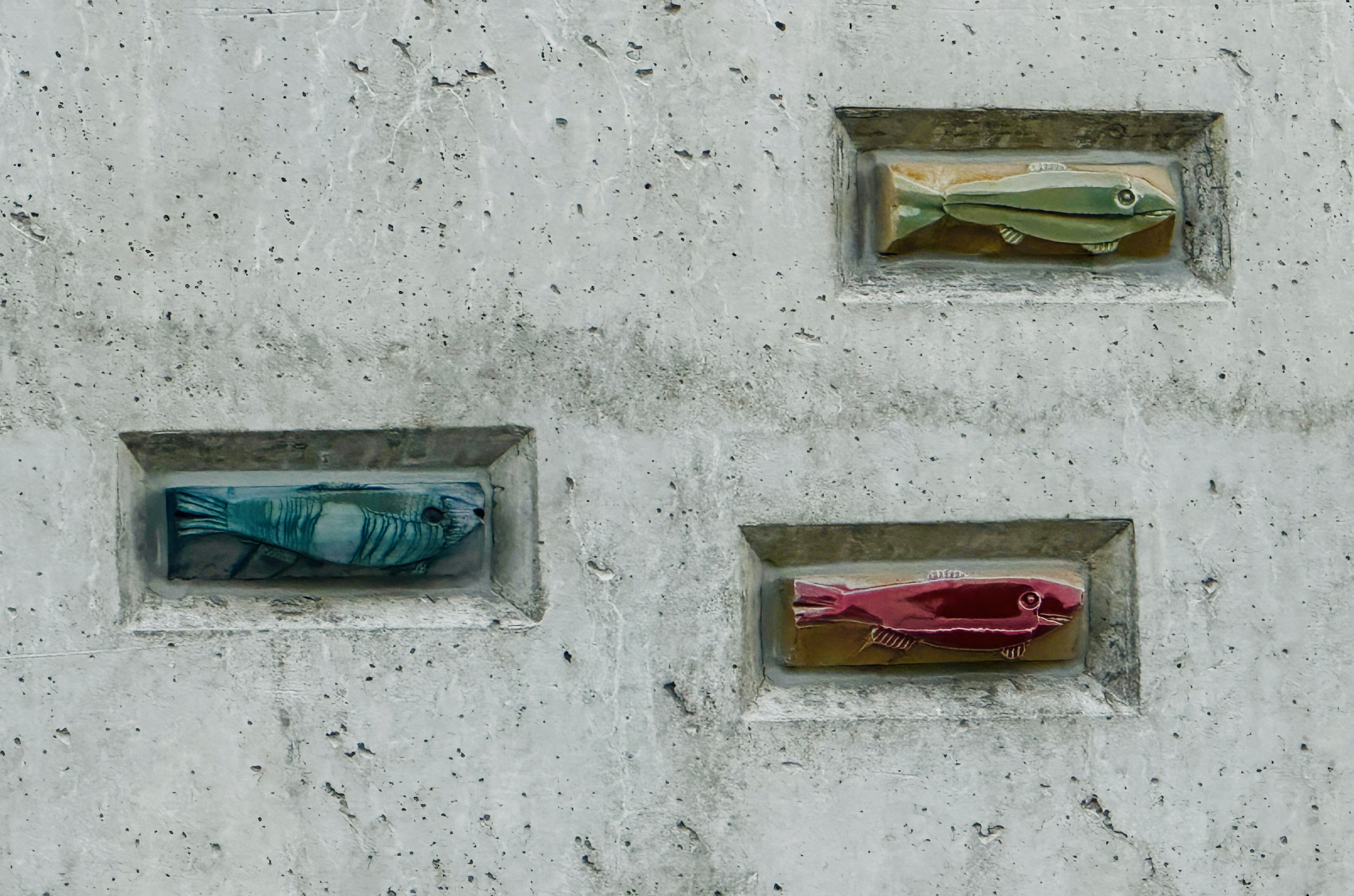 Am Schönsten wäre es ja (und lange Jahrzehnte sah es fast danach aus), wenn die Welt jeden Tag ein kleines wenig besser, vernünftiger oder zumindest schöner werden könnte. Irgendwann letzter Woche war dann Mal wieder so ein Tag. An der eigendlich häßlichen, neuen Beton-Stützmauer der Grafstraße, vor dem ehemalien Café Maurus verziehren nun 45 von Berger Bürgern finanzierte Keramikfische die Wand, die damit mit einem Schlag vomSchandfleck zu einem kleinen Schmuckstück der Gemeinde geworden ist. So schön sieht aus …