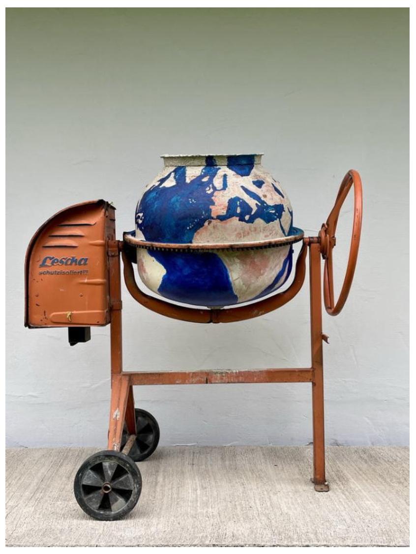 Für Hans Panschar in Allmannshausen geben die Motti der Ateliertage immer wieder Anlass, Werke jenseits seiner “normalen” Produktion von Häusern, Bergen, Booten und Stühlen zu präsentieren. Sein Betonmischer, Firma Lescha, zeigt eine Welt kurz vor dem Umkippen. (Für die Preisverhandlung: Der Listenpreis für einen neuen, funktionsfähigen Betonmischer der Firma beträgt 1279 €).