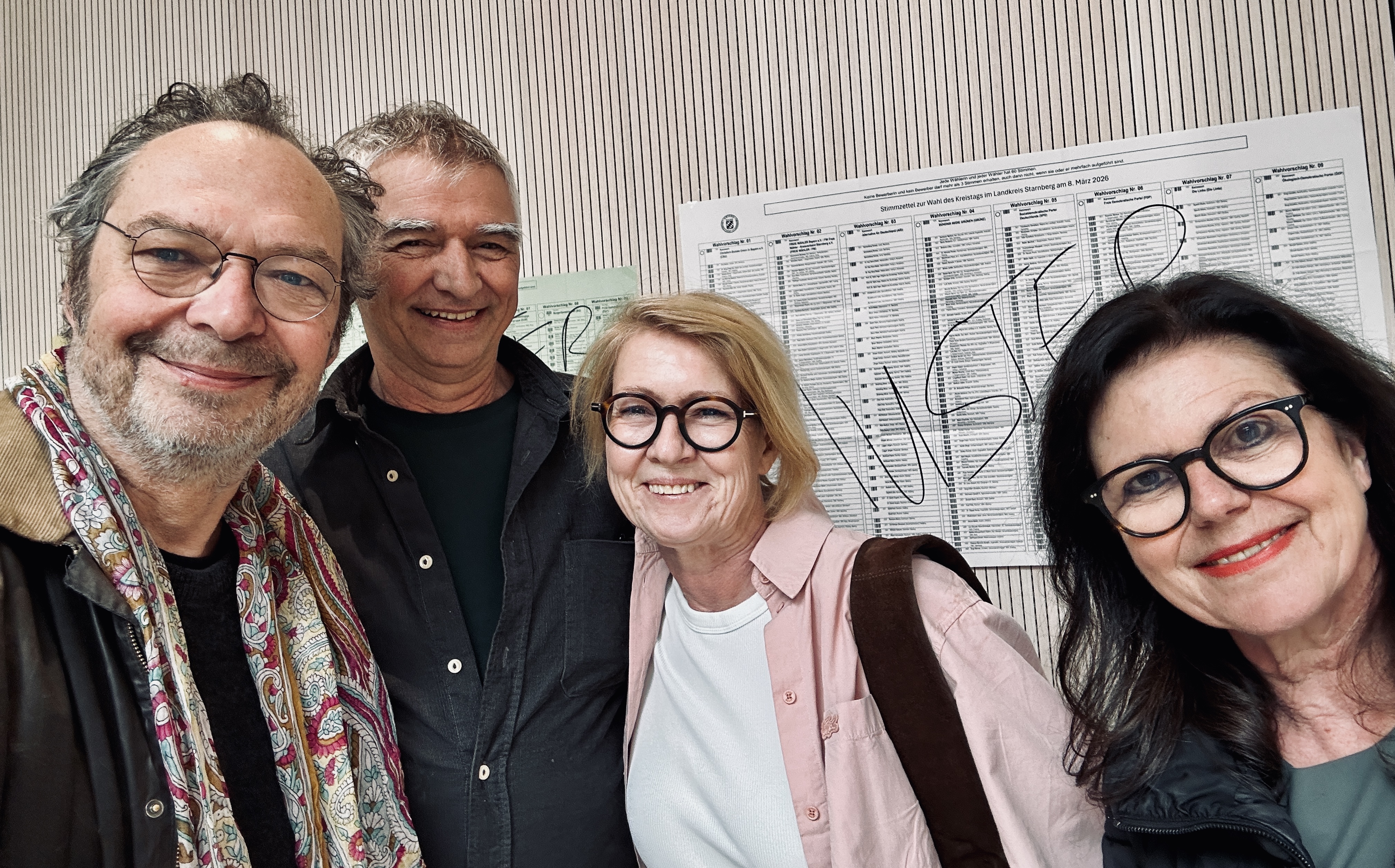 Wohlgemut: Die QUH Kandidatinnen Andy Ammer (#2), Ralf Grundmann (#19), Elli Grundmann (#4) und Elke Link (#1, Bürgermeisterinnenkandidatin) vor dem Wahllokal