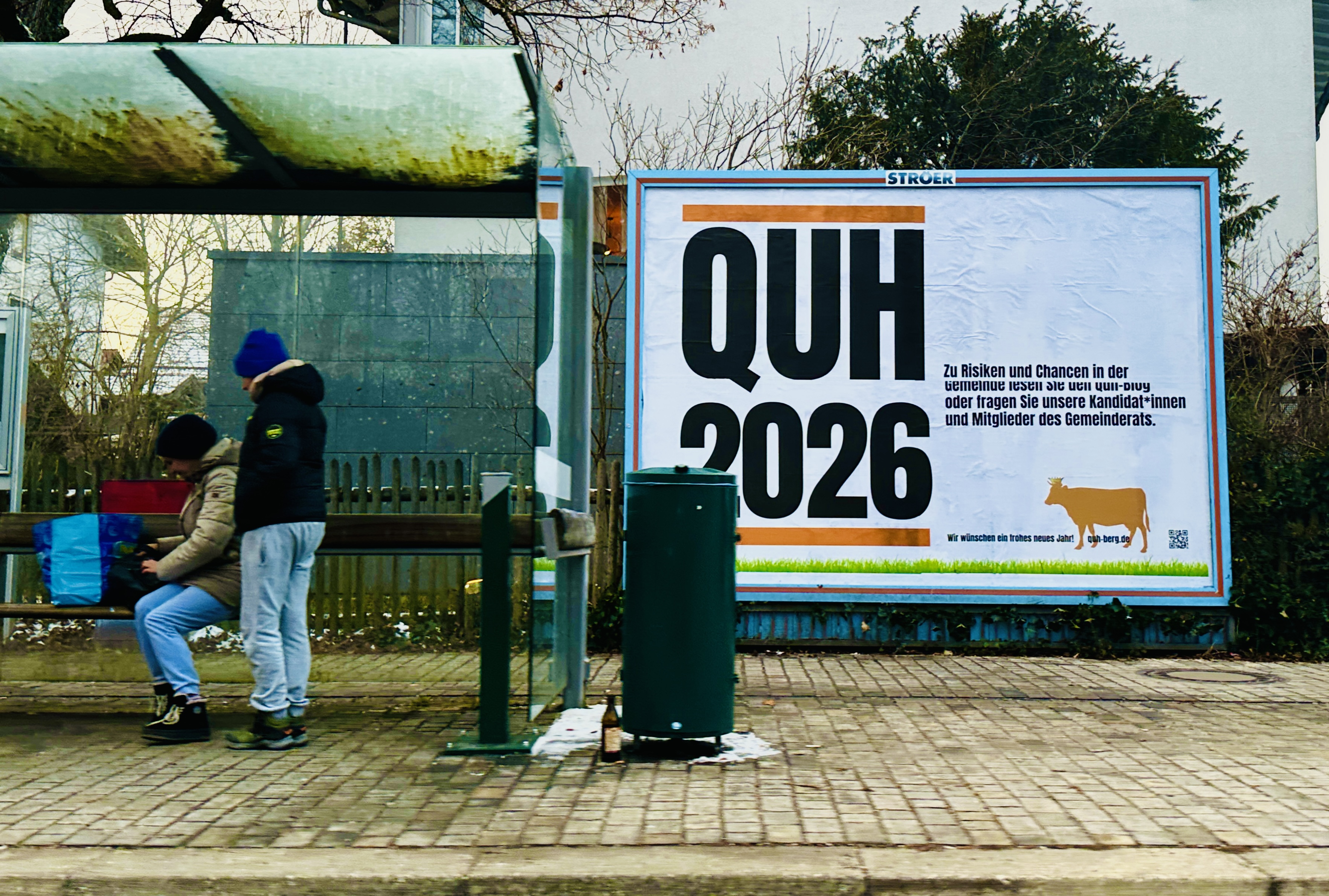 Zum Credo der QUH gehört es auch, unsere schöne Landschaft nicht mit Halbportraits unserer Kandidat/innen vollzustellen. Wir nutzen traditionell die Großleinwand am REWE-Markt, auf der Sie bis zur Wahl wechselnde Motive zu wechselnden Themen sehen werden (und beobachten können, wie das Gras langsam wächst). Auch im Wahlkampf gilt: wir wollen unser Dorf jeden Tag ein wenig schöner machen. Frohes 2026!