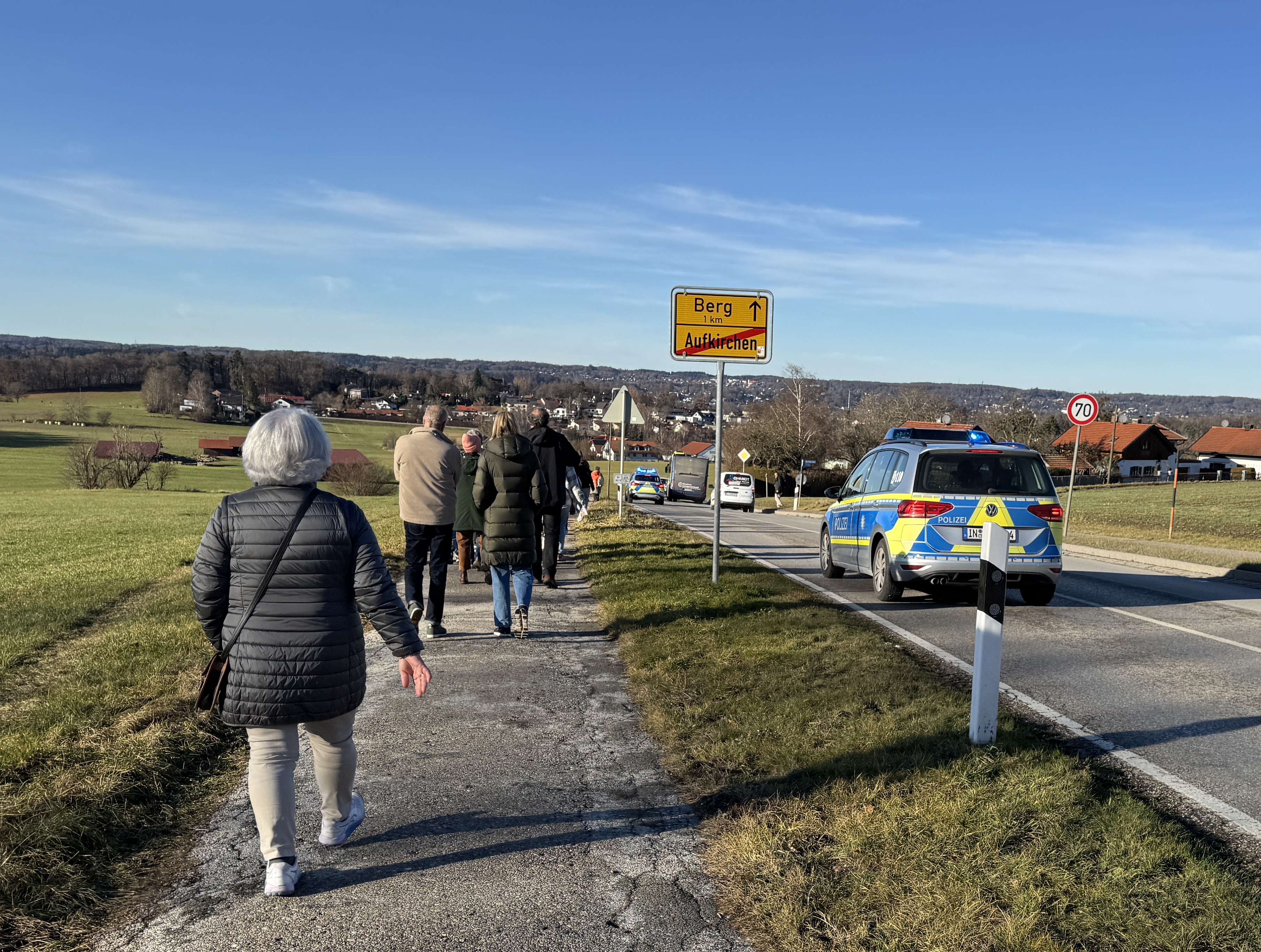 Die Veranstaltung war ordnungsgemäß angemeldet, die Polizei begleitete den Zug, leitete den Verkehr in sicherem Abstand um und war noch während der kurzen Reden bis zum Ende präsent. Unten am Parkplatz des MTV Berg stießen noch weitere Personen dazu.