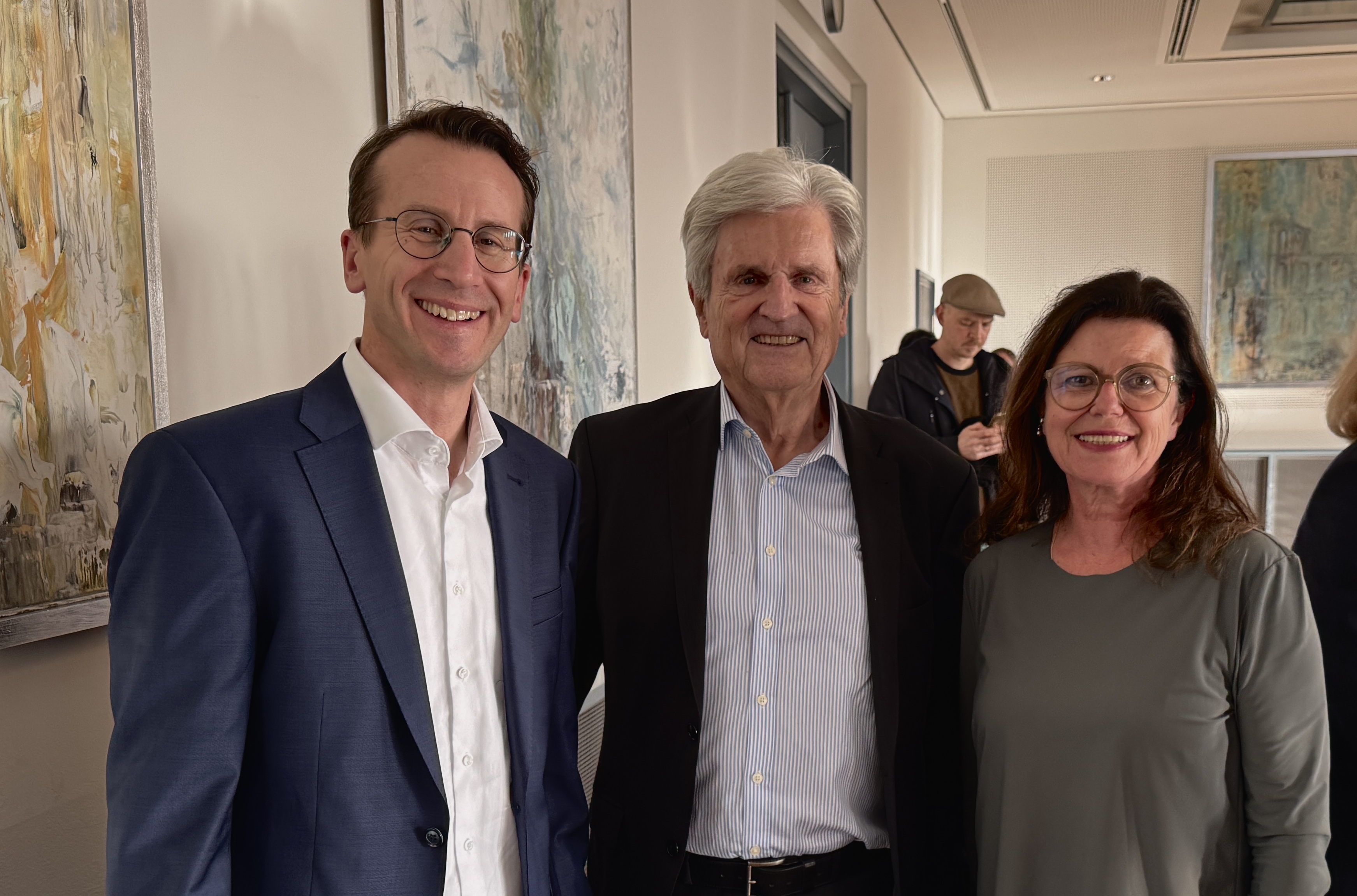 Landrat Stefan Frey, der auch Mitglied des Kuratoriums der Stiftung ist, Prof. Wulf von Schimmelmann, und Elke Link als Vertreterin der Gemeinde Berg