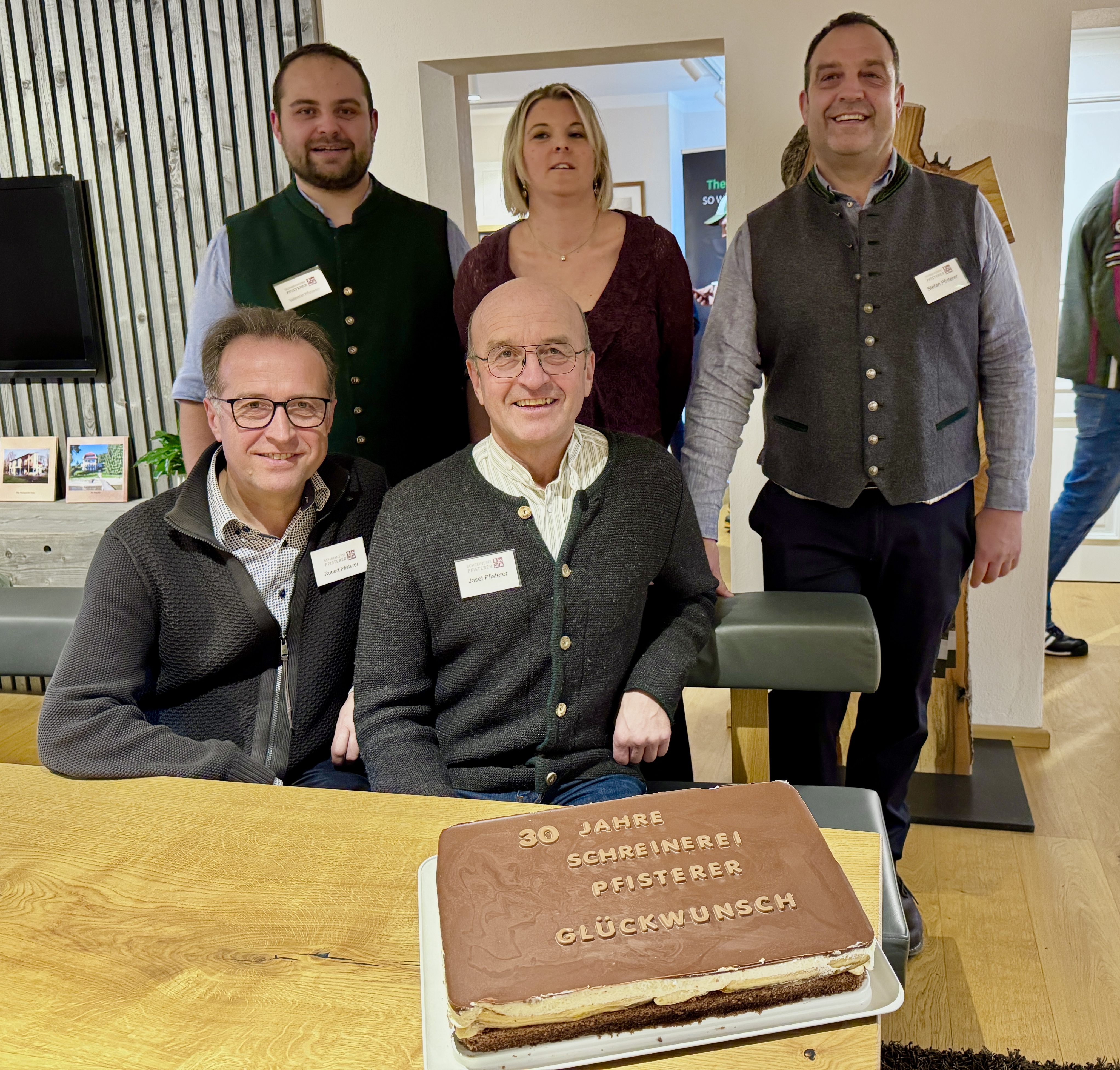 Gruppenbild mit Torte, gebacken von Andrea Huber – v.l.n.r.: Rupert,Valentin, Josef Pfisterer, Bettina Graf, Stefan Pfisterer