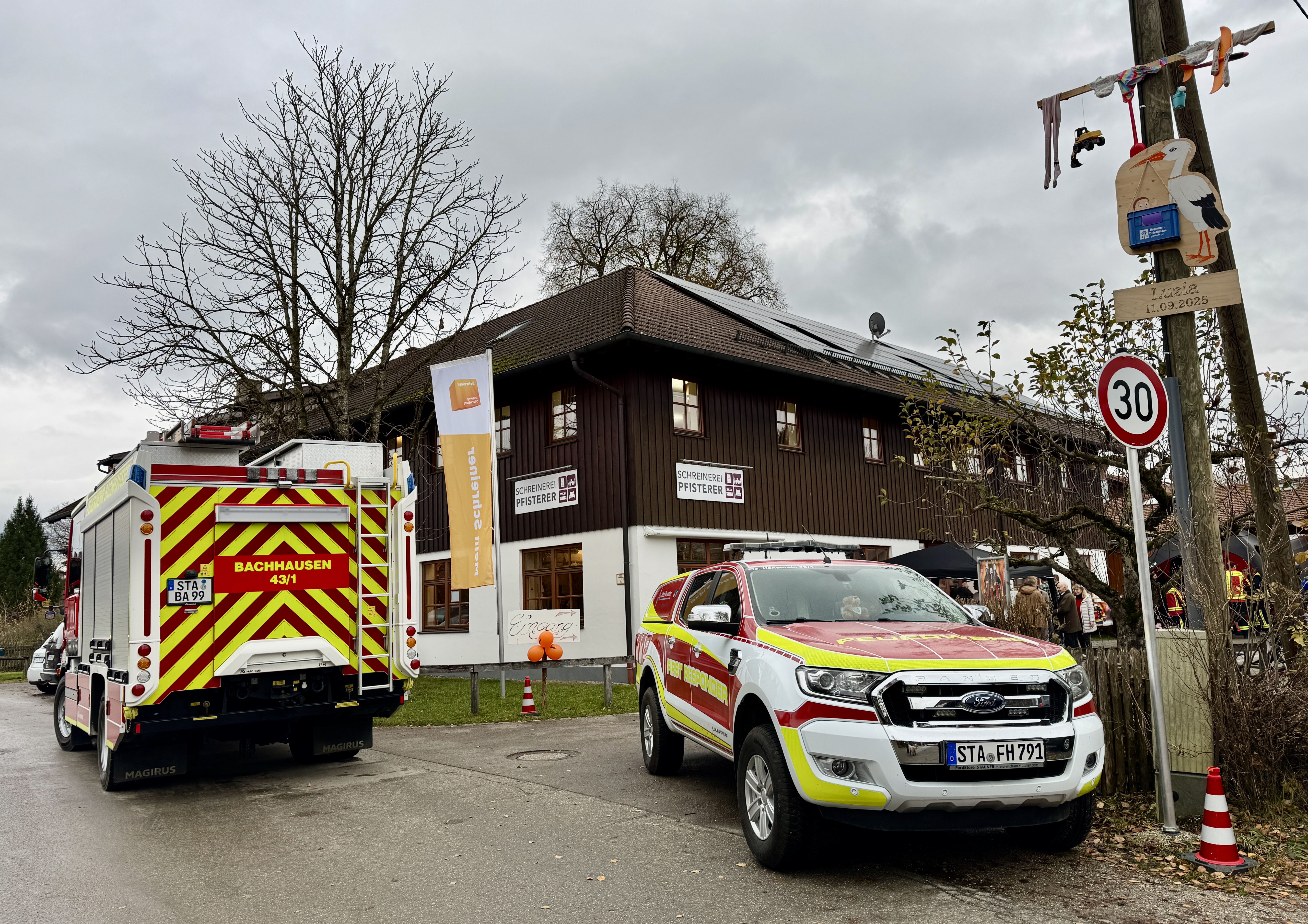Nicht nur dufte man der Schreienrei zum 30-jährigen Bestehen gratulieren, es gab auch vielfältige Informationsstäde und Mitmachaktionen – vom Thermomix über die Hüpfburg, die eine ganze Werkstatt füllte, bis zur Feuerwehr Bachhausen, die mitsamt ihrer Drohnenstaffel präsent war – und die ihr Feuerwehrhaus übrigens in Farchach hat. Und natürlich präsentierte sich die Schreinerei mit Ausstellungsstücken und dem sensatiionellen jährlichen Kuchenbüffet aus gefühlt 1000 Kuchen.